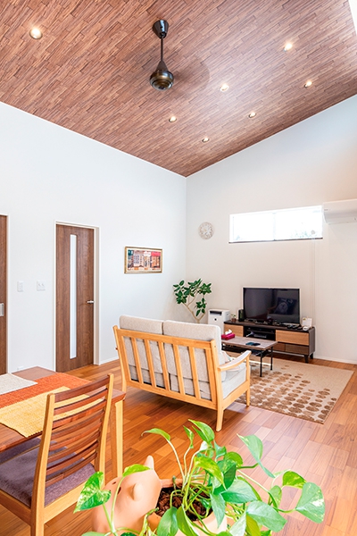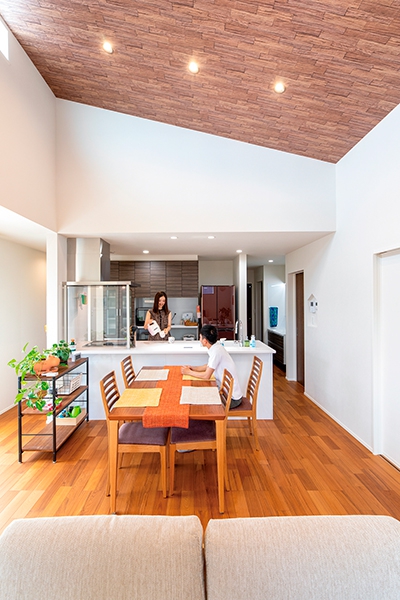 リビングの屋根高を最大限に活かした勾配天井の効果で、2階造の吹き抜け構造に負けない伸びやかさを演出しています。
