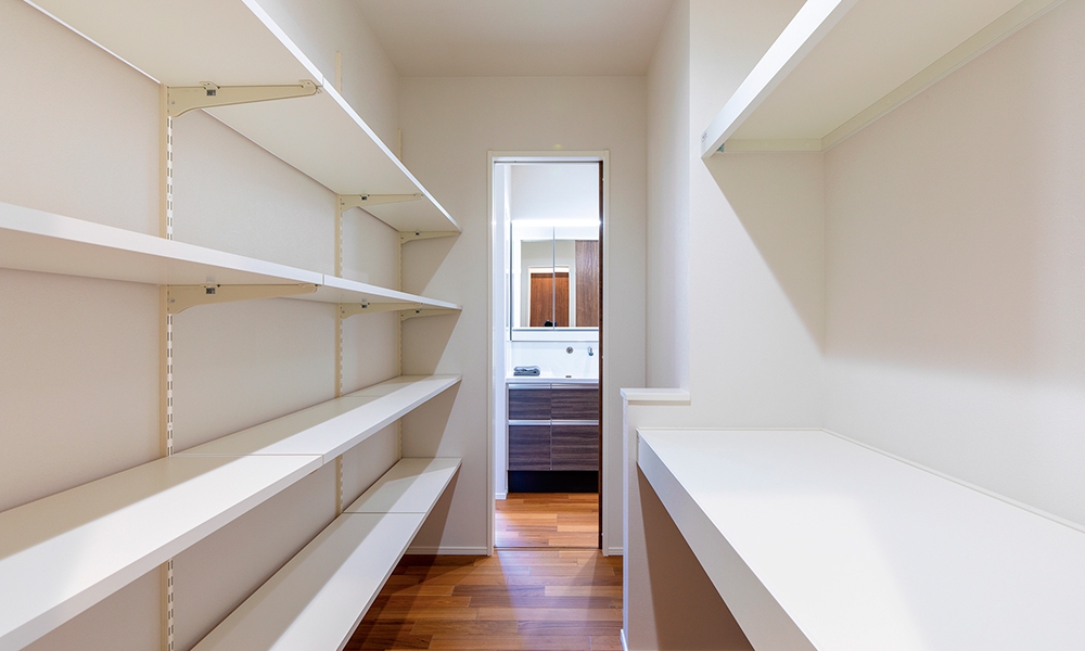 キッチン背面に設計されたウォークスルー収納は、頻繁に使う回遊動線としても利便性抜群!