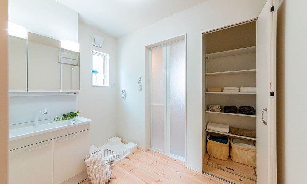 ドライルームとしても使えるよう調湿効果の高い珪藻土塗壁を採用した洗面脱衣室。