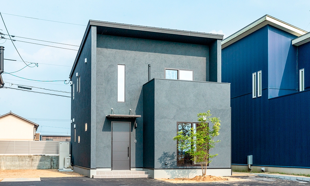 「来人プラン〕を象徴する片流れの屋根とボックス型のフォルムを覆う外壁には、独特の風合いが魅力のジョリパットを採用。