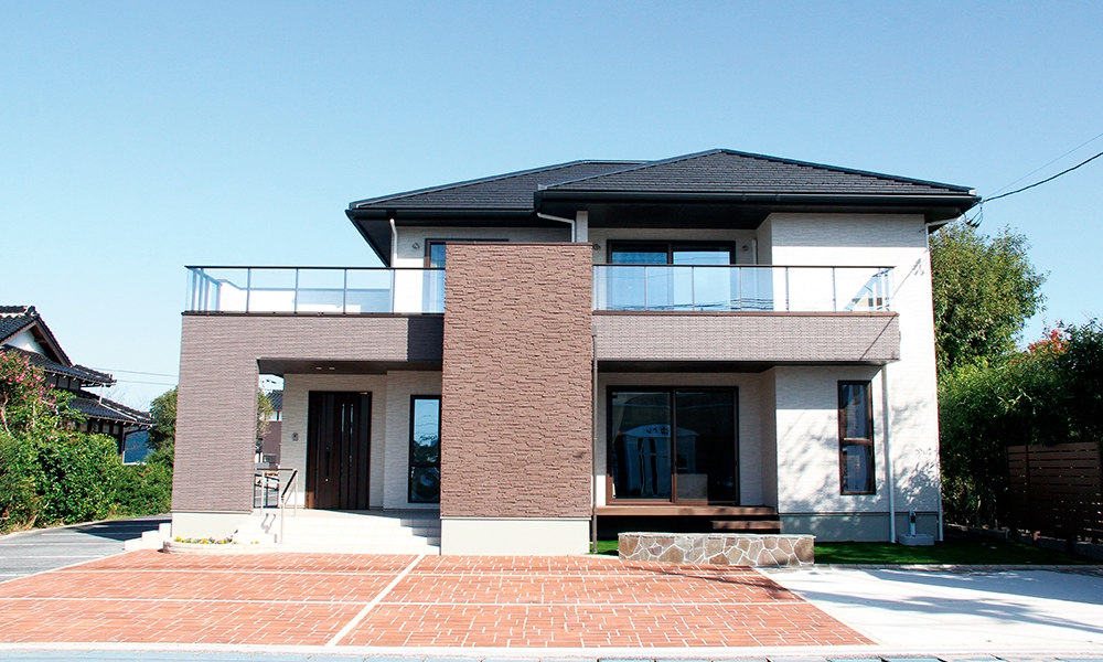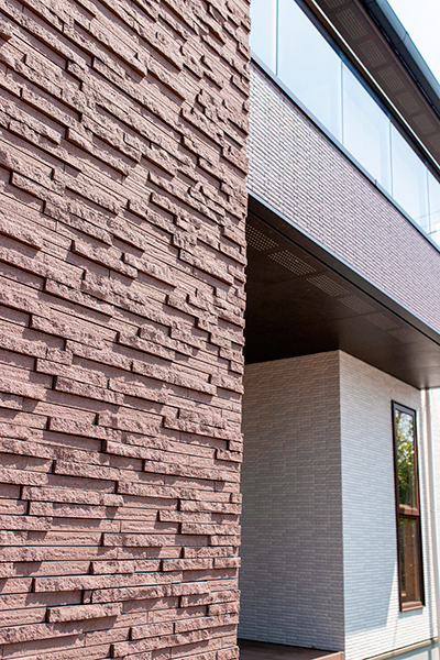 印象的な上質かつ丈夫なタイル外壁を内側から支えるのが、同社独自の耐力面材で構成されたモノコック構造と、