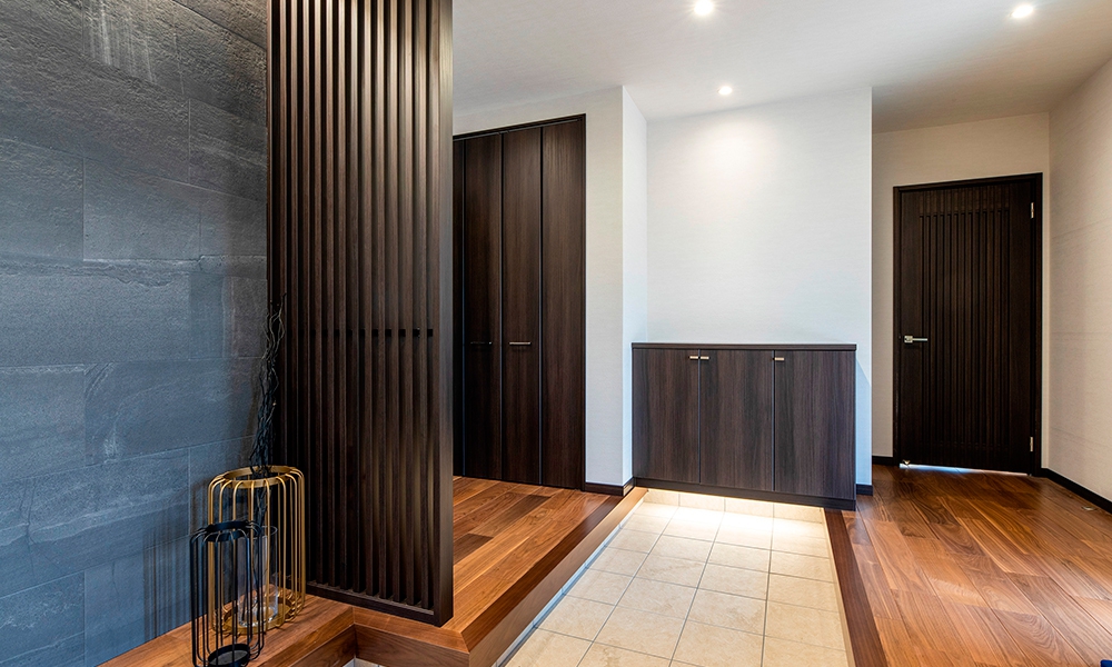 中央にはより高級感を醸し出す上質なアクセントタイルを使用。その裏側は、自転車置き場にも使える半屋内収納スペースになっている点にも注目。