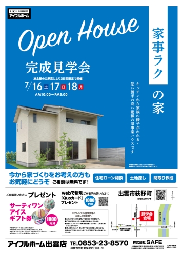 7/16.17.18【出雲市荻杼町】Open House 完成見学会 ―家事ラクの家―